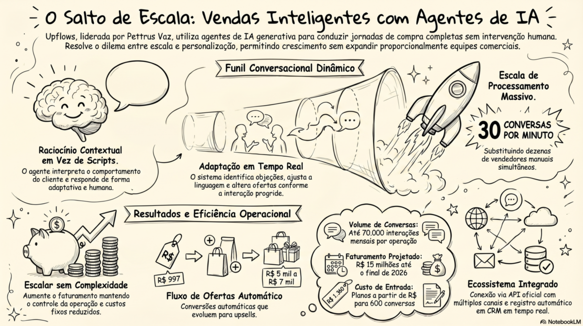 A inteligência artificial generativa tem transformado o atendimento e as vendas no comércio digital, com impacto direto na rentabilidade das empresas. A Upflows, plataforma liderada por Pettrus Vaz, utiliza agentes autônomos capazes de conduzir vendas com personalização em escala, otimizando a operação comercial.